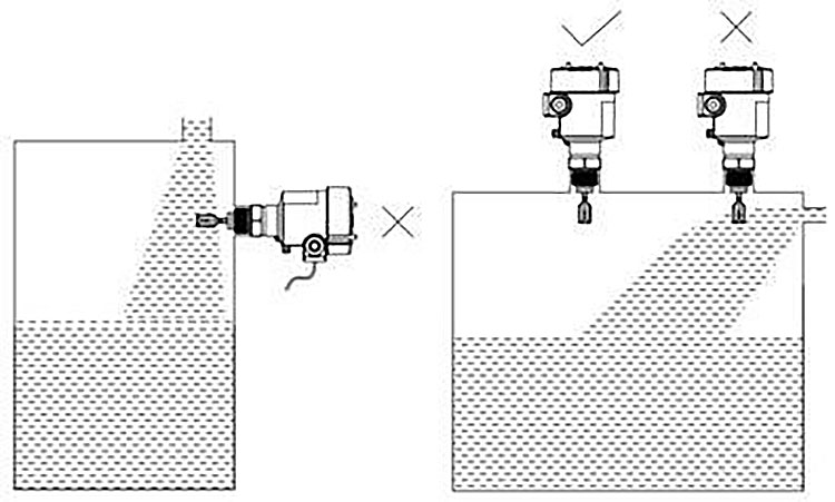 二、音叉液位開關(guān)測量注意事項    一般而言,為了保證音叉液位開關(guān)能夠可靠測量,需要注意一下幾點事項:    1、理論上講,音叉液位開關(guān)可以根據(jù)需要安裝在任何位置,但如果安裝在入料口位置而造成的測量誤差,甚至損壞儀表,所以,在安裝音叉液位開關(guān)時,應(yīng)盡量避開物料的進出口進行安裝。音叉液位開關(guān)的正確安裝方式如下: